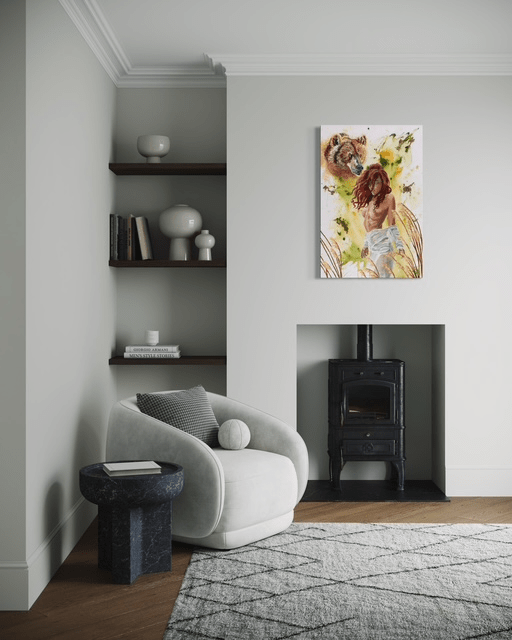 This original painting serves as a calm yet powerful focal point, ideal for collectors and spaces that embrace mythological symbolism and expressive contemporary art. The layered textures and organic movement shift with light, bringing a sense of stillness, breath, and quiet motion into the environment where it is displayed.