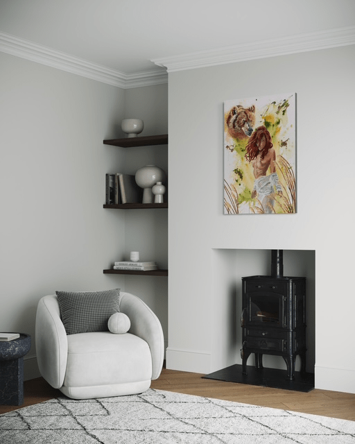 Aura: Goddess of the Breeze is an original painting inspired by the Greek goddess of the breeze and gentle wind. Flowing reeds, gathered fabric, and atmospheric movement reflect unseen natural forces, while the bear spirit overhead symbolizes instinct, protection, and quiet strength. The composition captures both softness and presence, embodying Aura’s nature as a divine force of air, breath, and motion.